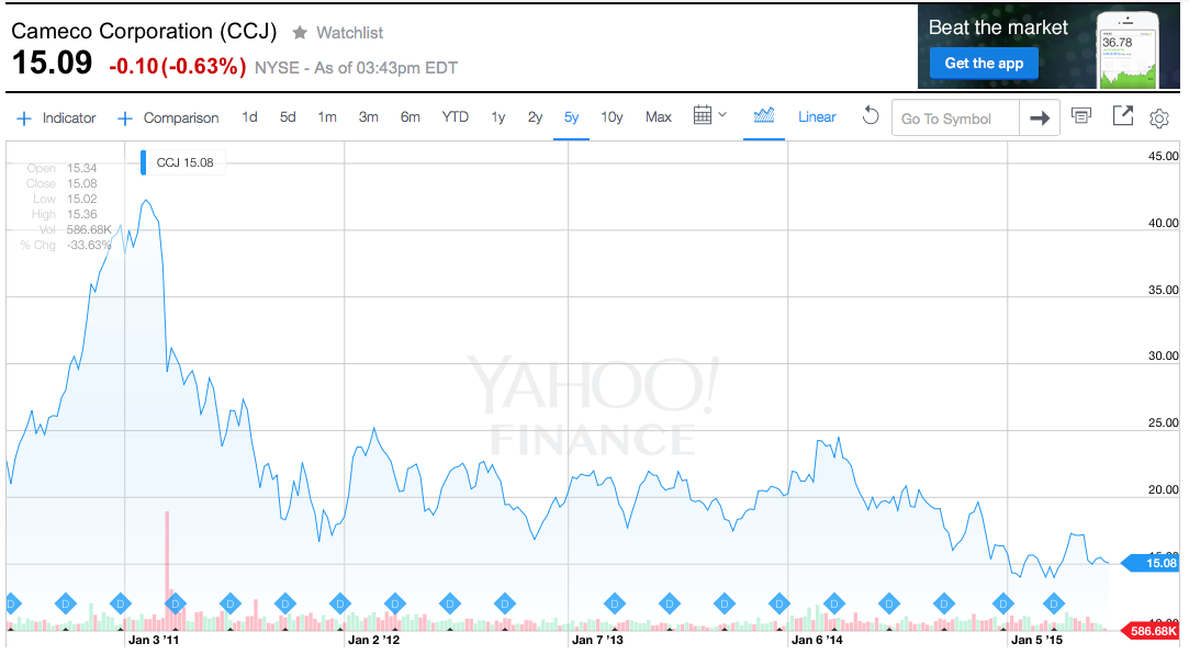Today we can see that Chris was on the mark, up to a certain point. Cameco skyrocketed in the year following the publication of this article, but since about early 2011, the corporation has continuously slumped downward.